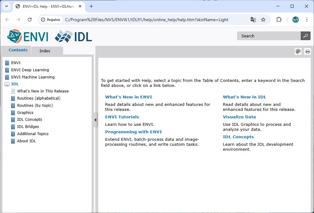 IDL Help local, com as opções de ajuda de outros produtos da NV5 instalados na mesma máquina